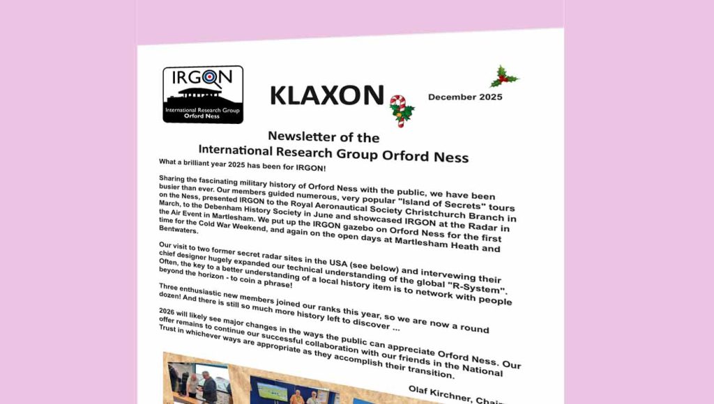 IRGON (International Research Group Orford Ness) is a group of volunteers who are interested in the wide-ranging military trials that have taken place on Orford Ness for many years.