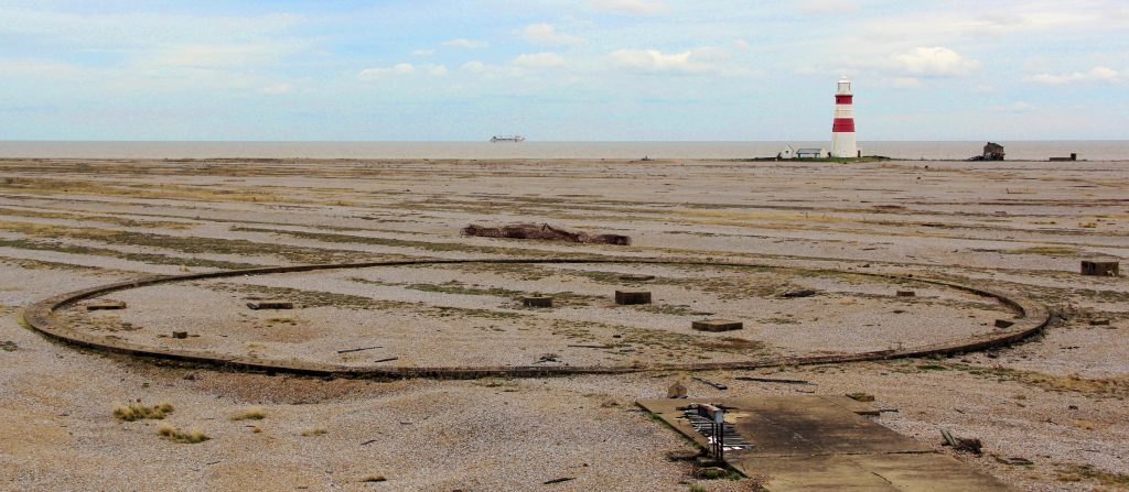 On my first visit to Orford Ness in 2018, one of the highlights was a visit to the Bomb Ballistic Building. From its roof, looking out over the shingle towards the lighthouse, is a large concrete ring. Our National Trust guide at the time had no explanation for this structure.