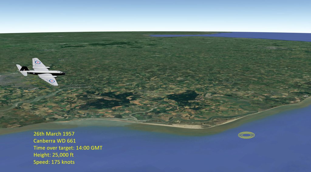 A typical telemetry sortie by Canberra WD 661 over Orford Ness on 26th March 1957. ©IRGON