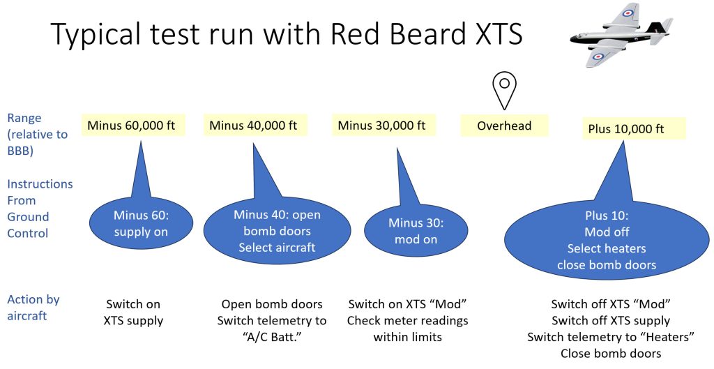 The solution was to fly models of the weapons fitted with the various critical components under test (e.g. turbo-generators for Red Beard and Yellow Sun, firing circuits, fusing units etc.). These test vehicles could be full-size models of the weapons concerned, or in the case of larger weapons like Yellow Sun, scale models when practical as the availability of V-bombers was a critical bottleneck. A scale model could be carried by a Canberra, and released at a realistic altitude and airspeed commensurate with a real sortie in a V bomber.