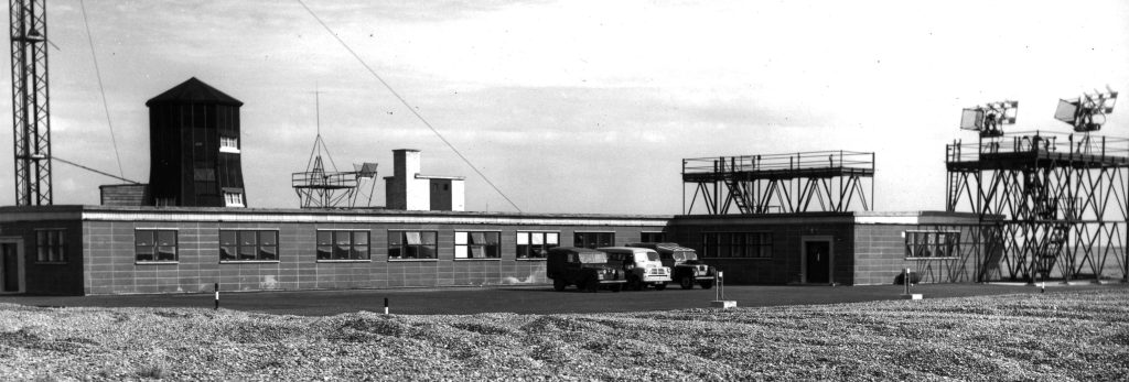 The Telemetry Building on Orford Ness, photographed in August 1956. The Black Beacon is visible in the background. Corner reflector aerials and helical arrays are visible on the framework at the right. © Crown Copyright / AWE 2021. Contains public sector information licenced under the Open Government Licence V3.0.